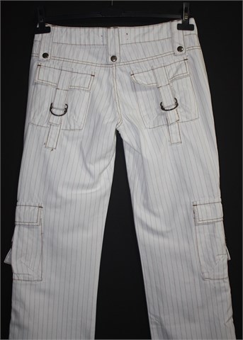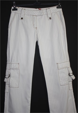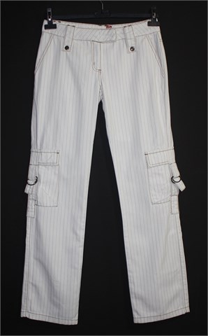 Vero moda hlače bijele boje sa sitnim isprekidanim prugicama (izmjenjuju se plavičasta i crvenkasta pruga). Prednji cif i kopčanje, pasica za remen. Prednji bočni džepovi, stražnji na preklop sa zatvaranjem, bočni džepovi na nogavicama. Deblji i kvalitetan pamuk.