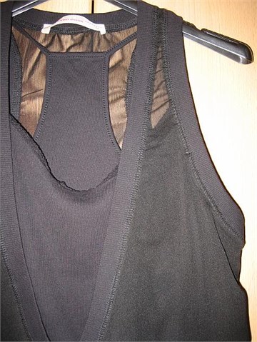 Unutarnji topić je crni i pamučni, vanjski također crn, blago proziran i materijal je kao viskoza. Guma na struku. Jako efektan i neobičan. Rastezljiv. Na majici piše veličina M.