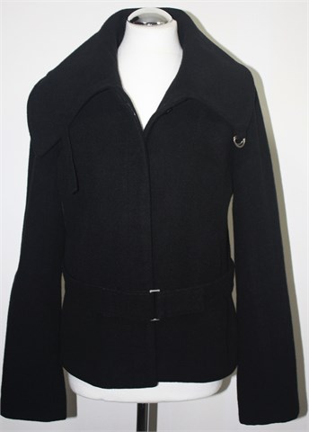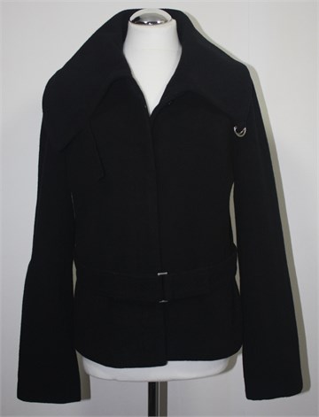 Vero moda vuneni kraći kaput crne boje. Prednje skriveno kopčanje na gumbe, vezanje u struku sa pripadajućim remenom od istog materijala. Bočni kosi džepovi, podstavljena (postava je crne boje sa printom).