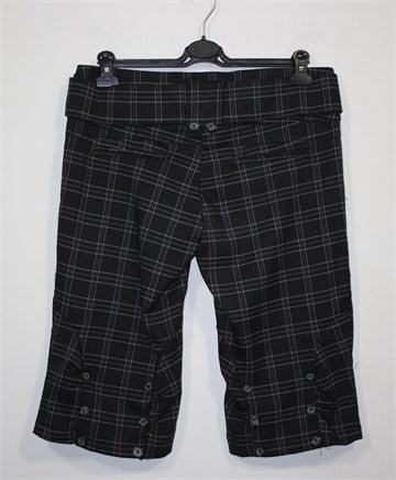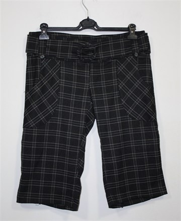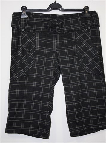 Vero moda poluduge hlače crno-sive boje sa prugastim uzorkom (materijal je kao tanji štof). Prednji cif i kopčanje, pasica za remen sa pripadajućim remenom (može se izvaditi). Prednji dublji bočni džepovi, stražnji samo ukrasni. Ukrasni gumbići sa stražnje strane nogavica. Materijal je blago rastezljiv.