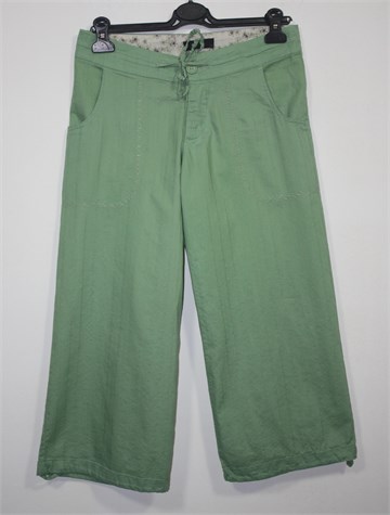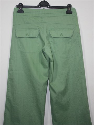 Vero moda hlače pastelno svijetlo zelene boje sa diskretnim prugastim uzorkom. Lagan i tanak pamuk. Prednji bočni džepovi (sa ukrasnim prošivima oko džepova od zelenog konca) i stražnje na preklop sa gumbom. U pasicu je uvezena špagica koja se veže sa prednje strane. Na dnu nogavica špagica za zatezanje (ušivena u pasicu).
