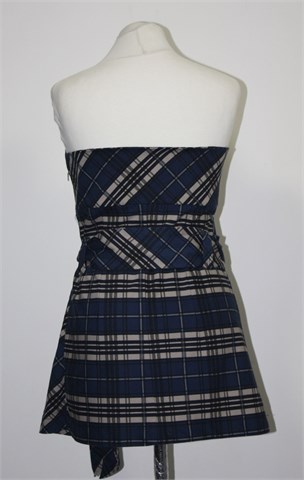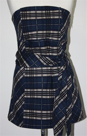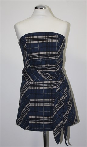 Vero moda kratka haljinica/tunika bez naramenica, plavo-sive boje sa prugastim uzorkom (kao na slici). Bočni cif, plastične žice sa prednje strane (ušivene da drže formu gornjeg dijela). Blago rastezljiv materijal, deblji pamuk. Pripadajući remen od istog materijala.