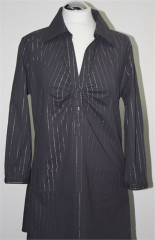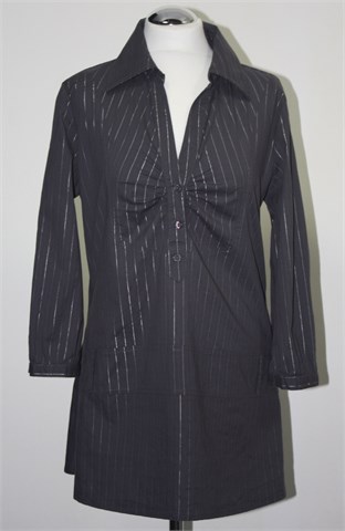 Vero moda tunika sa poludugim rukavima, tamno sive boje sa srebrnim prugicama. Prednje kopčanje, ušitci na grudima. Pasica sa ušitcima za remen (bez remena). Čvrst i blago rastezljiv materijal.