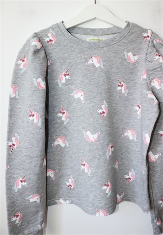 Vertbaudet majica sa dugim rukavima, sive boje sa printom jednoroga (vidljivo na slikama). Srednje debljine, malo rastezljiva.