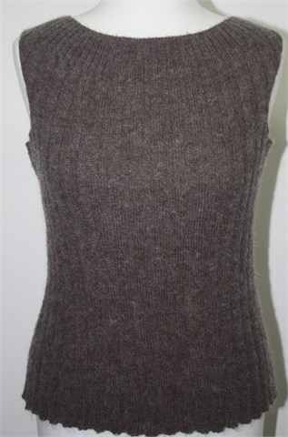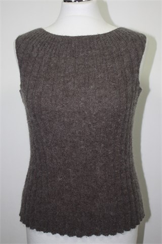 Vesta bez rukava, prošarano smeđe boje. Mekano i mucasto pletivo, rastezljivo.