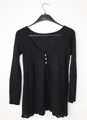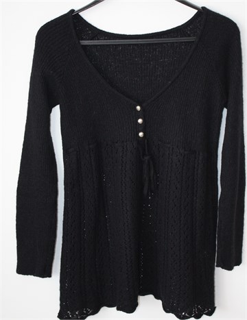 Vesta sa dugim rukavima, crne boje. Tri prednja ukrasna gumbića, vezica ispod prsiju. Pletivo je djelomično rupičasto (providno). Srednje debljine, mucasto i rastezljivo pletivo.
