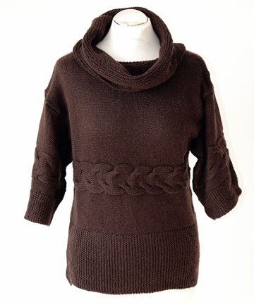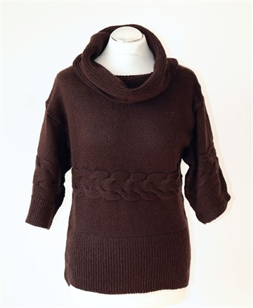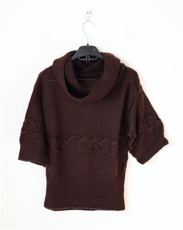 Vesta/dolčevita sa poludugim rukavima, tamno smeđe boje. U pletivu mjestimičan uzorak pletenica (vidljivo na slikama). Deblja i rastezljiva.