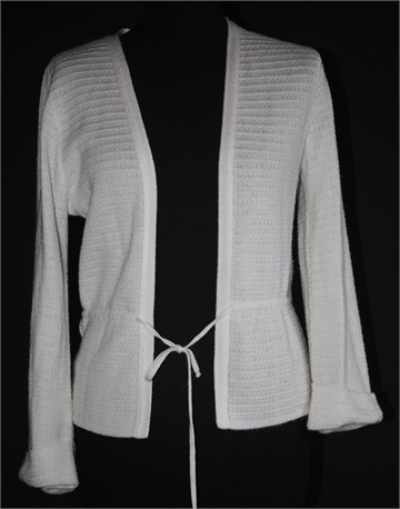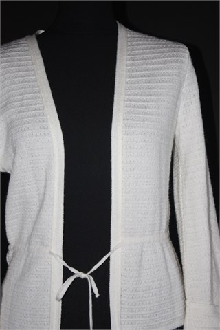 Lagani kardigan bijele boje sa prednjim vezanjem na špagice. Pletivo ima rupičasto/prugasti uzorak. Rukavi nisu skroz dugački i malo su širi.