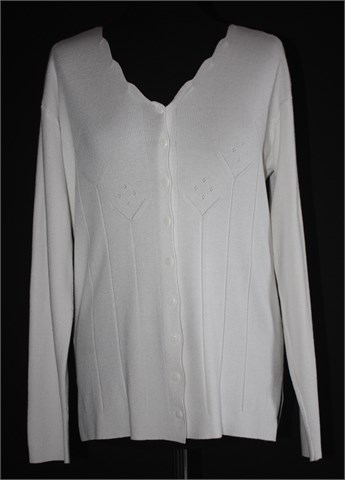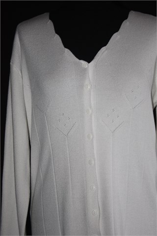 Vesta na kopčanje/kardigan dugih rukava, bijele boje. Lijepi detalji oko dekoltea i na prsima. Mekana i rastezljiva.