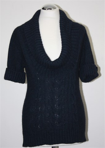 Vesta sa kratkim rukavima, prošarano plave boje. Veći ovratnik, gumbić na kraju svakog rukava. Sa prednje strane uzorak pletenica.