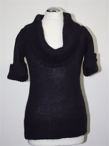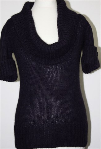 Vesta sa kratkim rukavima i većim ovratnikom, tamno prošarano ljubičaste boje. Deblje, mucasto i rastezljivo pletivo.