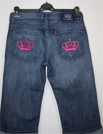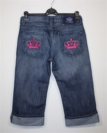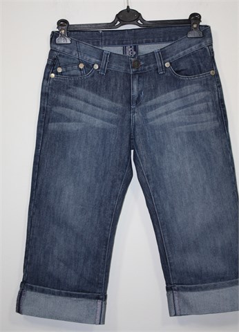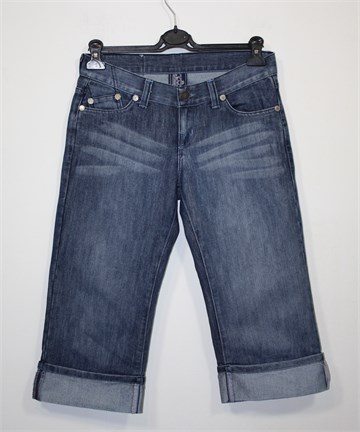Rock & Republic (Victoria Beckham) poluduge traper hlače, srednje plave boje mjestimično ispranog izgleda - used look. Prednji cif i kopčanje, pasica za remen. Prednji i stražnji džepovi (stražnji ukrašeni aplikacijom od konca i cirkona).
