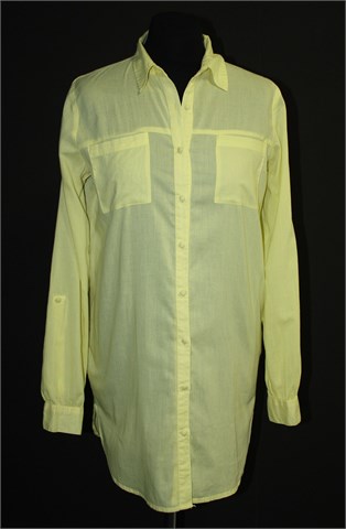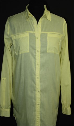 Vila dugačka košulja/tunika lijepe žute boje. Prednje kopčanje, džepovi na prsima. Jedan rukav se može nositi kao poludugi (ima unutarnju vezicu i vanjski gumbić), drugi rukav nema (ne znam da li je greška ili tako mora biti :)). Lagan i tanak pamuk, blago proziran.