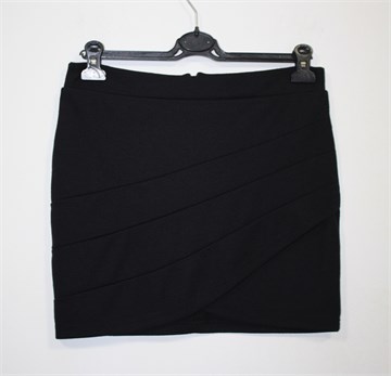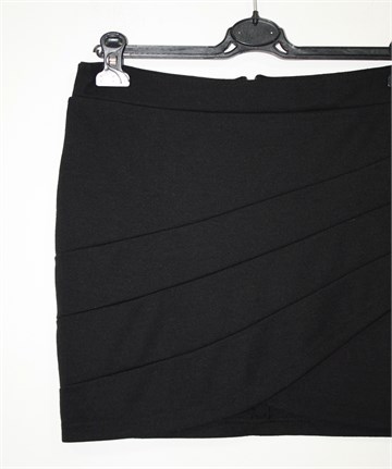 Vila kratka suknja crne boje sa fiksnim preklopom i ukrasnim prošivima sa prednje strane (djeluje kao bandage). Mekan i rastezljiv materijal, podstavljena. Stražnji cif, nešto duža sa stražnje strane (sa prednje strane u sredini je najkraća - vidjeti mjere).