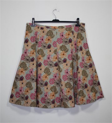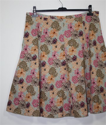 Villager (Liz Claiborne) pamučna suknja tamnije bež boje sa šarenim cvjetnim printom (boje i uzorci kao na slici). Bočni cif i kopčica, podstavljena. Lagana i prozračna.