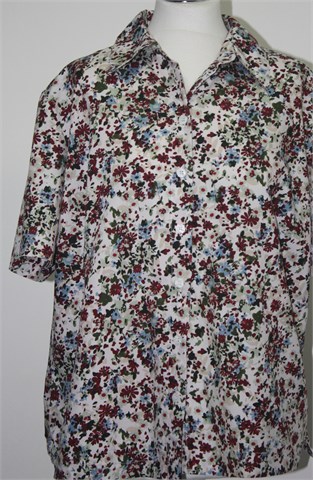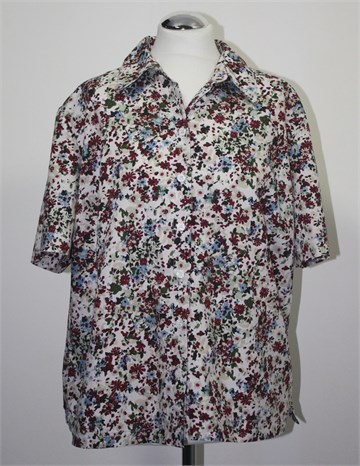 Vilona košulja sa kratkim rukavima, bijele boje sa šarenim cvjetnim printom. Prednje kopčanje, prednji ušitci za grudi i mali bočni prorezi. Čvrst i nerastezljiv pamuk.