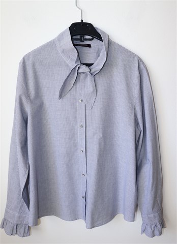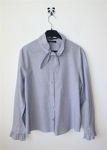 Violeta by Mango prugasta košulja, kombinacija plave i bijele boje. Prednje kopčanje sa ukrasnim gumbićima (svi gumbi su ukrašenim cirkonima), vezanje oko vrata, volančić na kraju svakog rukava. Tanka i lagana, nije rastezljiva.