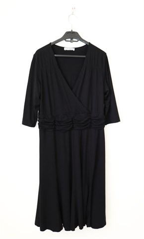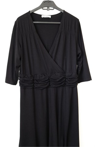 Vivance haljina sa poludugim rukavima, crne boje. Sa prednje strane (u gornjem dijelu) fiksni preklop, u struku je materijal nabran. Tanka i rastezljiva.