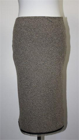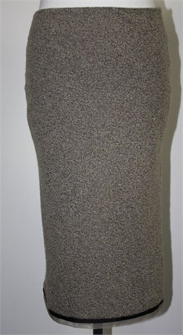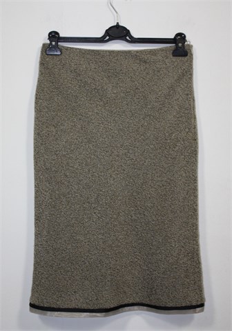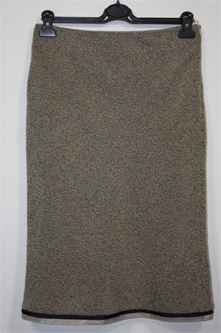 Voice of Europe suknja prošarano bež-smeđe boje, materijal je mekan i mucast. Bočni cif i kopčanje, podstavljena. Na dnu suknje našivena je ukrasna smeđa traka i blago sjajan tilasti materijal. Odličan model, super se prilagođava tijelu (rastezljiva).