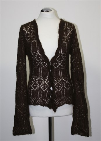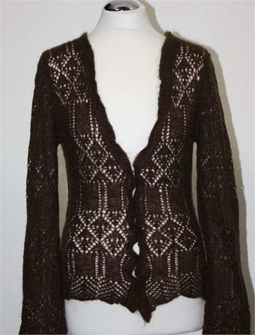Voice of Europe vesta sa kopčanjem na male kukice sa prednje strane, tamno smeđe boje. Rupičasti uzorak u pletivu. Tanja, mekana i rastezljiva.