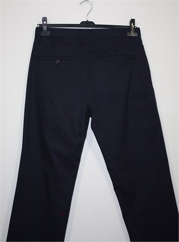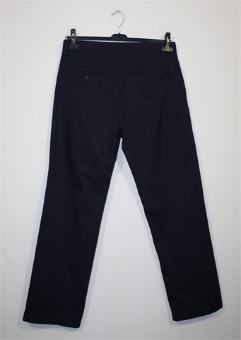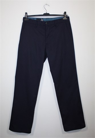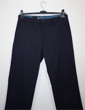 Volcom hlače tamno plave boje sa prugama (bordo/ljubičaste boje). Prednji cif i kopčanje, pasica za remen. Prednji i stražnji džepovi. Mekan i gladak materijal.