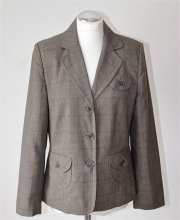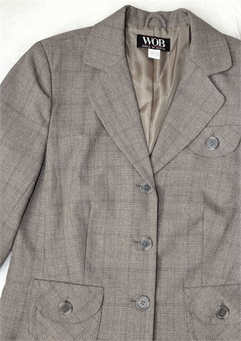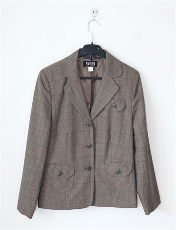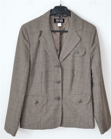 W.O.B. sako sivo-smeđe boje sa uzorkom (vidljivo na slikama). Prednje kopčanje, bočni džepovi sa preklopom, ukrasni džepić na prsima. Blagi jastučići u ramenima, podstavljen. Nije rastezljiv.
