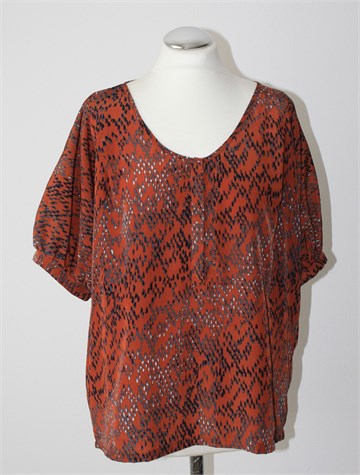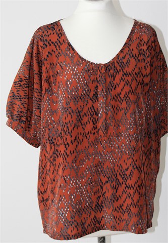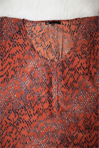 WE bluza sa kratkim i širokim rukavićima, smeđe boje sa printom/uzorkom na materijalu (vidljivo na slikama). Prednje skriveno kopčanje do cca pola dužine, ušitci sa prednje i stražnje strane. Nešto je duža sa stražnje strane (vidjeti mjere).