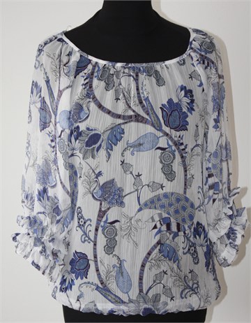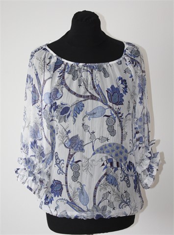 Wallis bluza sa poludugim rukavima, bijele boje sa printom (boje i uzorak printa vidljivi na slikama). Gumica u pasici i na krajevima rukava, na rukavima mali volančići. Tanka i lagana, providna. Odličan, blago rastezljiv materijal, ne mora se peglati.