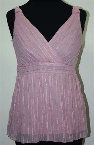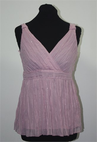 Wallis topić/bluza roze boje, ukrašen rozim crtama od konca ze koje su našivene prozirne šljokice/ljuskice. Bočni cif, lagan i prozračan materijal. Podstavljen rozom podstavom.