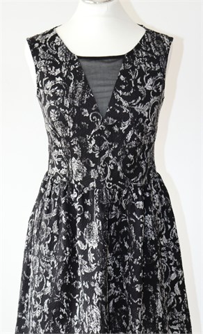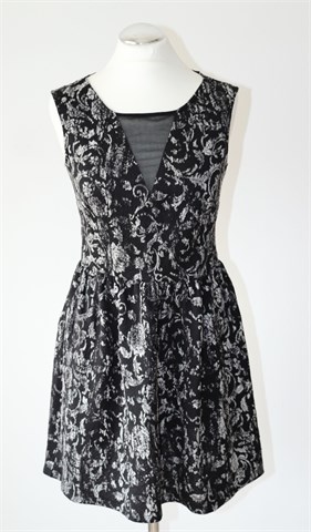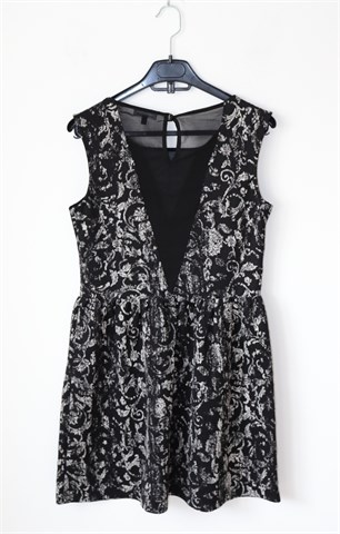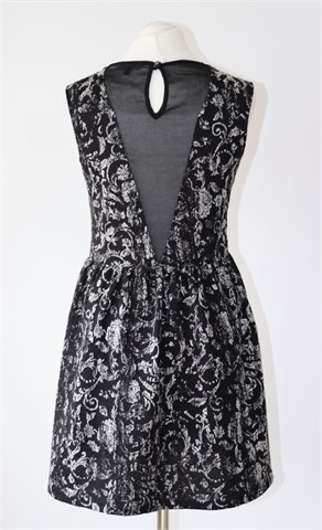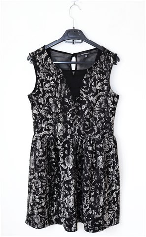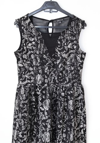 Warehouse haljina bez rukava, crno-bijele boje sa uzorkom na materijalu (vidljivo na slikama). Dekolte i dio na leđima materijal crne boje, na vratu gumbić. Rastezljiv materijal, reljefne teksture.