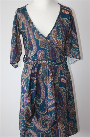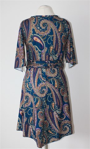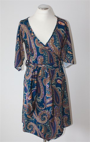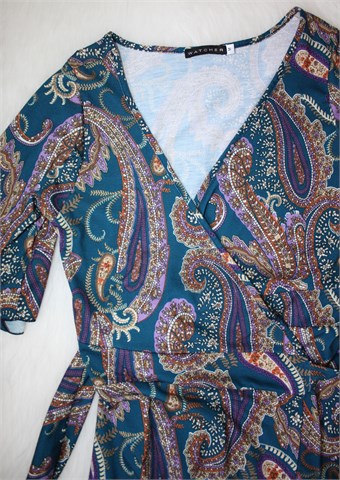 Watcher haljina petrolej boje sa šarenim paisley printom (boje i uzorak printa vidljivi na slikama). Sa prednje strane preklop, bočne trake koje se po želji vežu sa prednje strane. Rukavi su nešto između kratkih i poludugih, koso rezani i pri dnu su širi. Blago rastezljiva, asimetrična dužina.