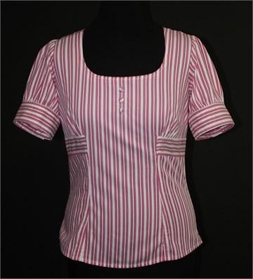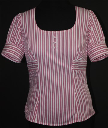 Dizajnerska Willi Smith bluza sa kratkim rukavima, bijele boje sa crnim i rozim prugama. Blagi puf rukavići, ukrasni gumbići. Bočni cif, prednji i stražnji ušitci (strukirana). Rastezljiv materijal.