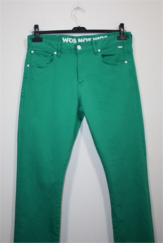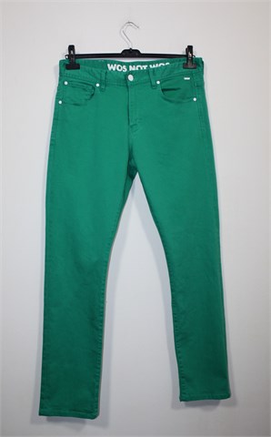 Wos Not Wos traper hlače svijetlo zelene boje (pastelna nijansa blago ispranog izgleda). Prednji cif i kopčanje, pasica za remen. Prednji i stražnji klasični džepovi. Ravne i uže nogavice, hlače su rastezljive.