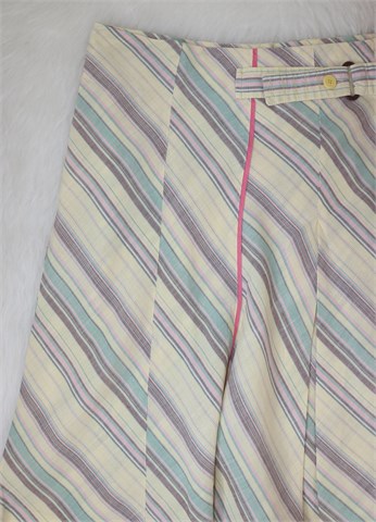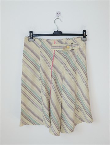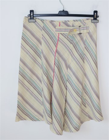 X-Nation suknja od lana, svijetlo pastelno žute boje sa kosim prugama u pastelnim bojama (roza, ljubičasta, plavo-zelena - vidljivo na slikama). Bočni cif, ukrasni remenčić sa prednje strane. Lagan ali čvrst materijal, blago rastezljiv. Na sredini sa prednje strane je duža od ostatka suknje (vidjeti mjere).
