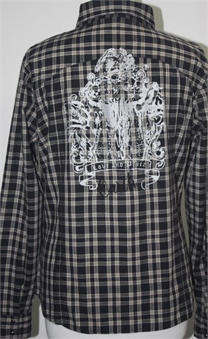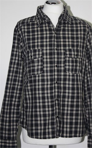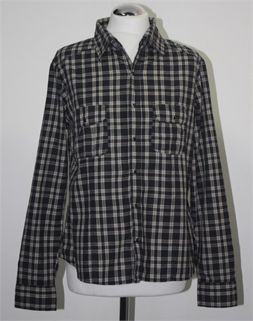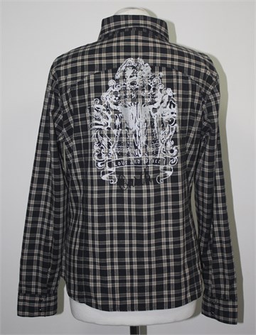 X-mail košulja sa dugim rukavima, prljavo bijelo-crne boje s uzorkom (kao na slici). Sa stražnje strane srebrni print i aplikacije od konca. Košulja ima prednje kopčanje sa crnim drukerima, džepiće sa preklopom i gumbom na prsima (maleno oštećenje na materijalu kod džepića).