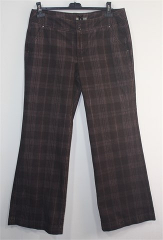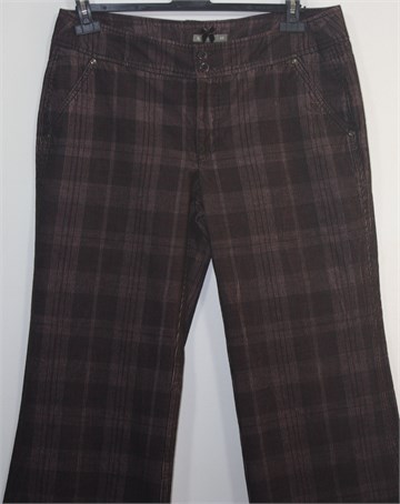 X-nation hlače od sitnog samta, smeđe boje sa uzorkom (kockastim-kariranim). Hlače imaju prednji cif i kopčanje, prednje i stražnje klasične džepove. Šire nogavice, mekan i sitan samt.