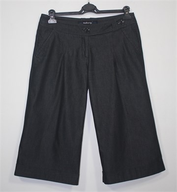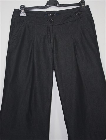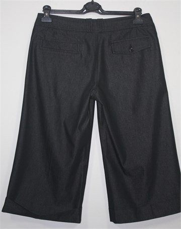 X-nation poluduge hlače, tamno sive boje (materijal je blago sjajan). Hlače imaju prednji cif i kopčanje, više ukrasna pasica za remen. Prednji bočni džepovi, jedan stražnji džep je samo ukrasni, drugi na preklop sa gumbićem. Mandžete na dnu nogavica.