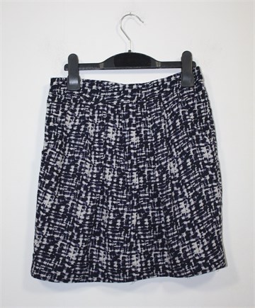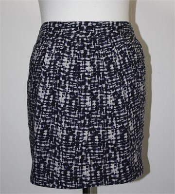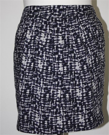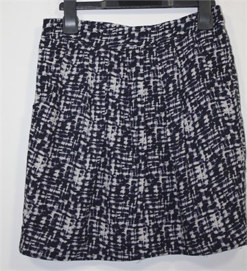XXI (Forever 21) suknja sa prošaranim uzorkom (boje su crna, bijela i svijetlo ljubičasta). Sa prednje strane ukrasni ušitci, bočni džepovi. Sa stražnje strane pasice je ušivena guma pa je širina prilagodljiva. Podstavljena.