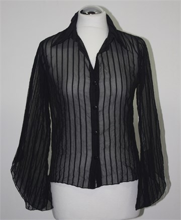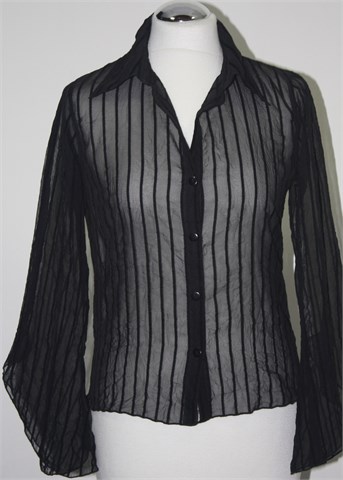 Xanaka košulja sa poludugim rukavima, crne boje sa prugama. Prednje kopčanje, stražnji ušitci (blago strukirana). Prozirna, pruge su blago plišane. Rukavi su na krajevima koso rezani.