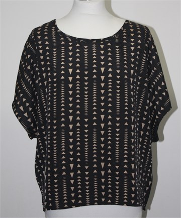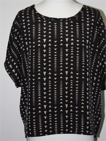 Xhilaration bluza crne boje sa prednjim uzorkom u bež boji. Prednji dio je svilenkast, stražnji dio je lagani viskozni materijal. Vrlo efektna, može se nositi u casual i svečanijim kombinacijama. Stražnji dio majice je rastezljiv, prednji nije.