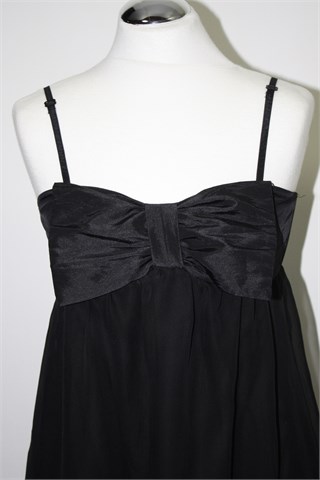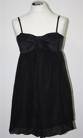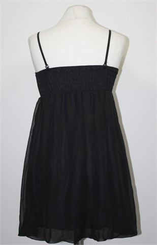 Xhilaration kraća haljina (tunika) sa tankim podesivim naramenicama (mogu se skinuti), crne boje. Sa prednje strane ukrasna mašna, sa stražnje strane prošivena gumicama pa je širina prilagodljiva (vidjeti mjere). Donji dio lagan i lepršav materijal, podstavljena.