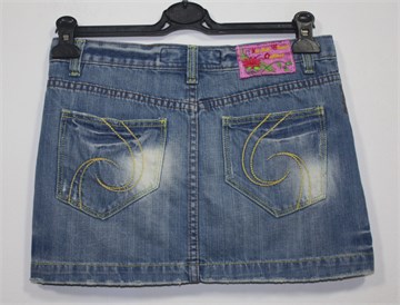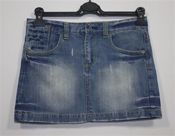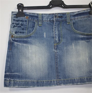 Yes Miss kratka suknja od trapera, svijetlo plave boje mjestimično ispranog i ocufanog/podrapanog izgleda. Prednji cif i kopčanje sa drukerima (bile su kopčice ali su zamijenjene sa drukerima), prednji i stražnji klasični džepovi.