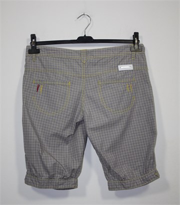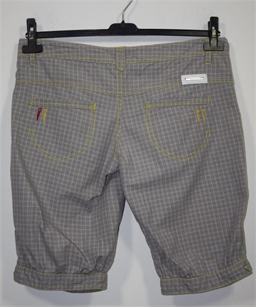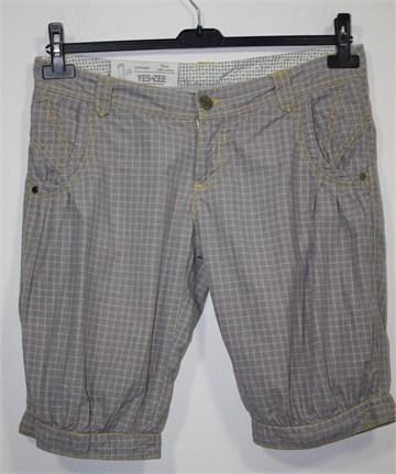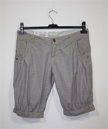 Yes Zee bermude sive boje sa žutim prugasto-kockastim uzorkom. Prednji cif i kopčanje, pasica za remen. Prednji bočni, stražnji ukrasni džepovi. Prošivene žutim koncem. Lagan i tanji pamuk.
