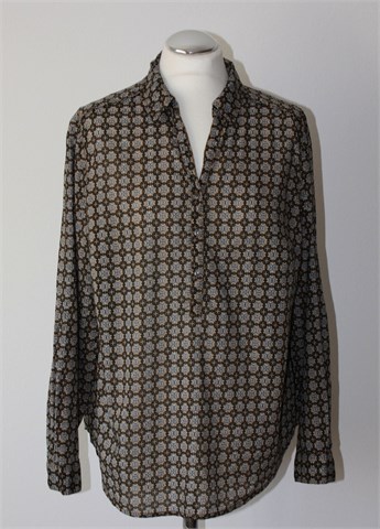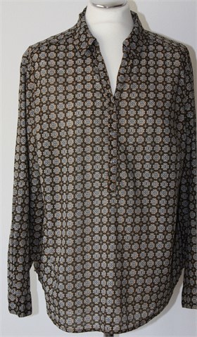 Yessica (C&A) bluza sa dugim rukavima (mogu se nositi i kao kraći - gumbić sa vanjske strane rukava i vezica unutar rukava), kombinacija crne, bijele i smeđe boje sa printom (uzorak printa vidljiv na slikama). Prednji gumbići, malo duža sa stražnje strane (vidjeti mjere). Nije rastezljiva.