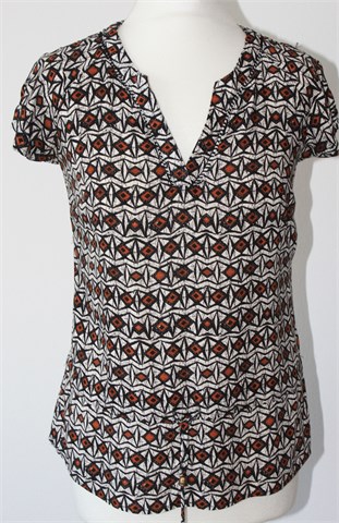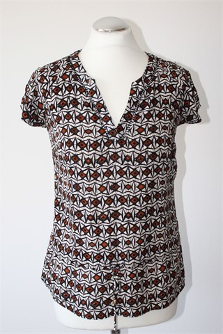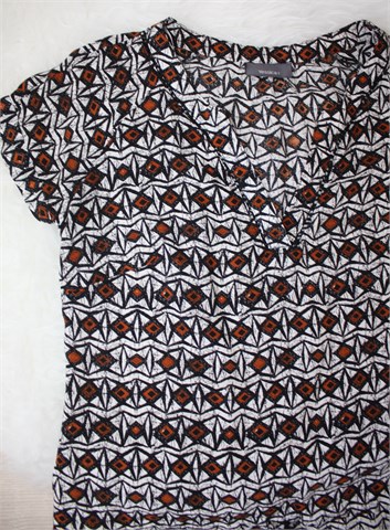 Yessica (C&A) bluza sa kratkim rukavima i prošaranim printom (uzorak printa kao na slikama - boje su crna, bijela i smeđa). Pri dnu bluze uvedena je špagica koja se po želji može stegnuti. Lagana i prozračna.