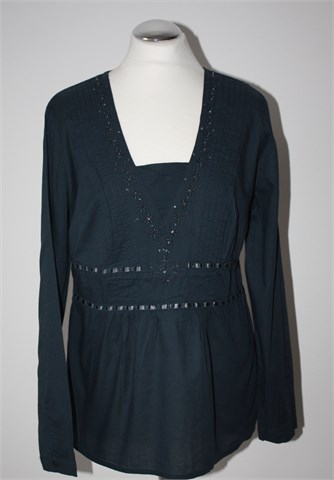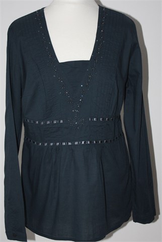 Yessica (C&A) bluza sa dugim rukavima, tamno petrolej plavo-sive boje. Sa prednje strane našivene aplikacije (ukrasne trake uvezene po sredini bluze). Gumbić na kraju svakog rukava, bočni cif. Tanji i lagan pamuk, nije rastezljiv.