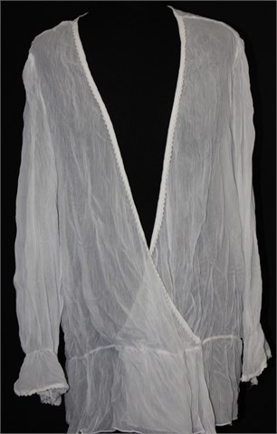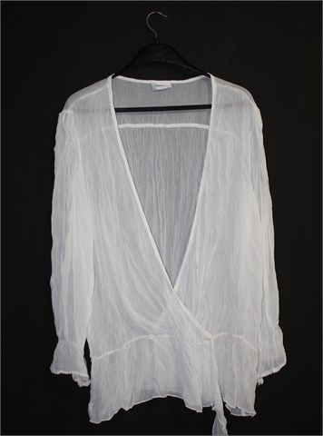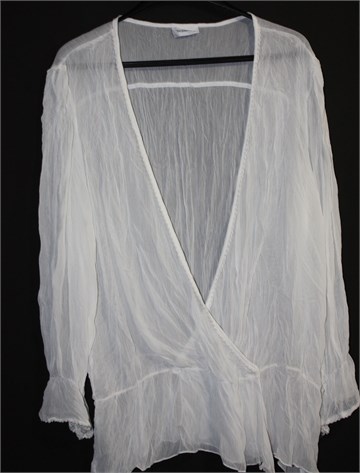 Yessica (C&A) bluza/tunika bijele boje, zgužvani materijal. Prednji fiksni preklop, gumica u struku i na krajevima rukava. Prednji otvor i rubovi rukava obrubljeni su heklanom ukrasnom trakicom. Tanka i providna, rastezljiva.