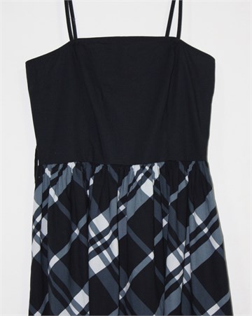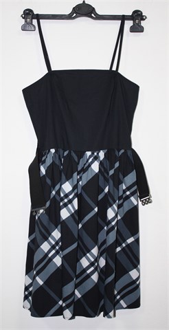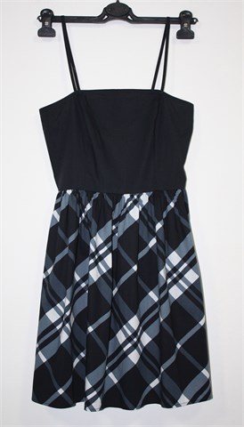 Yessica (C&A) haljina sa tankim podesivim naramenicama, crne boje - donji dio sa printom u sivoj i bijeloj boji. Bočni cif, bočne ušice za remen sa pripadajućim rastezljivim remenom (može se izvaditi).