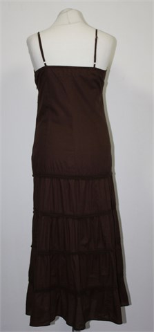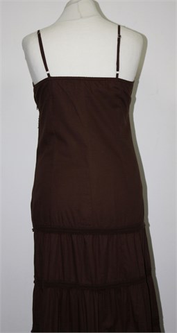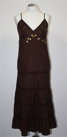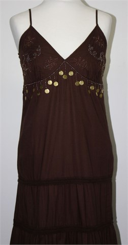 Yessica (C&A) haljina bez rukava, tamno smeđe boje. Sa prednje strane aplikacije od konca i našivene perlice, naramenice su podesive dužine. Bočni cif, podstavljena. Sa stražnje strane (uz gornji šav) rastezljiva. Lagan i prozračan pamuk.