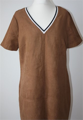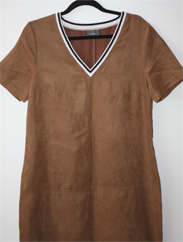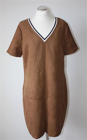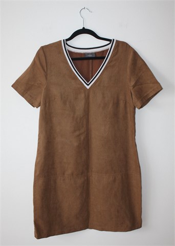 Yessica (C&A) haljina sa kratkim rukavima, svijetlo smeđe boje. Bočni cif, podstavljena. Materijal djeluje kao brušena koža (umjetni materijal), nije rastezljiv.